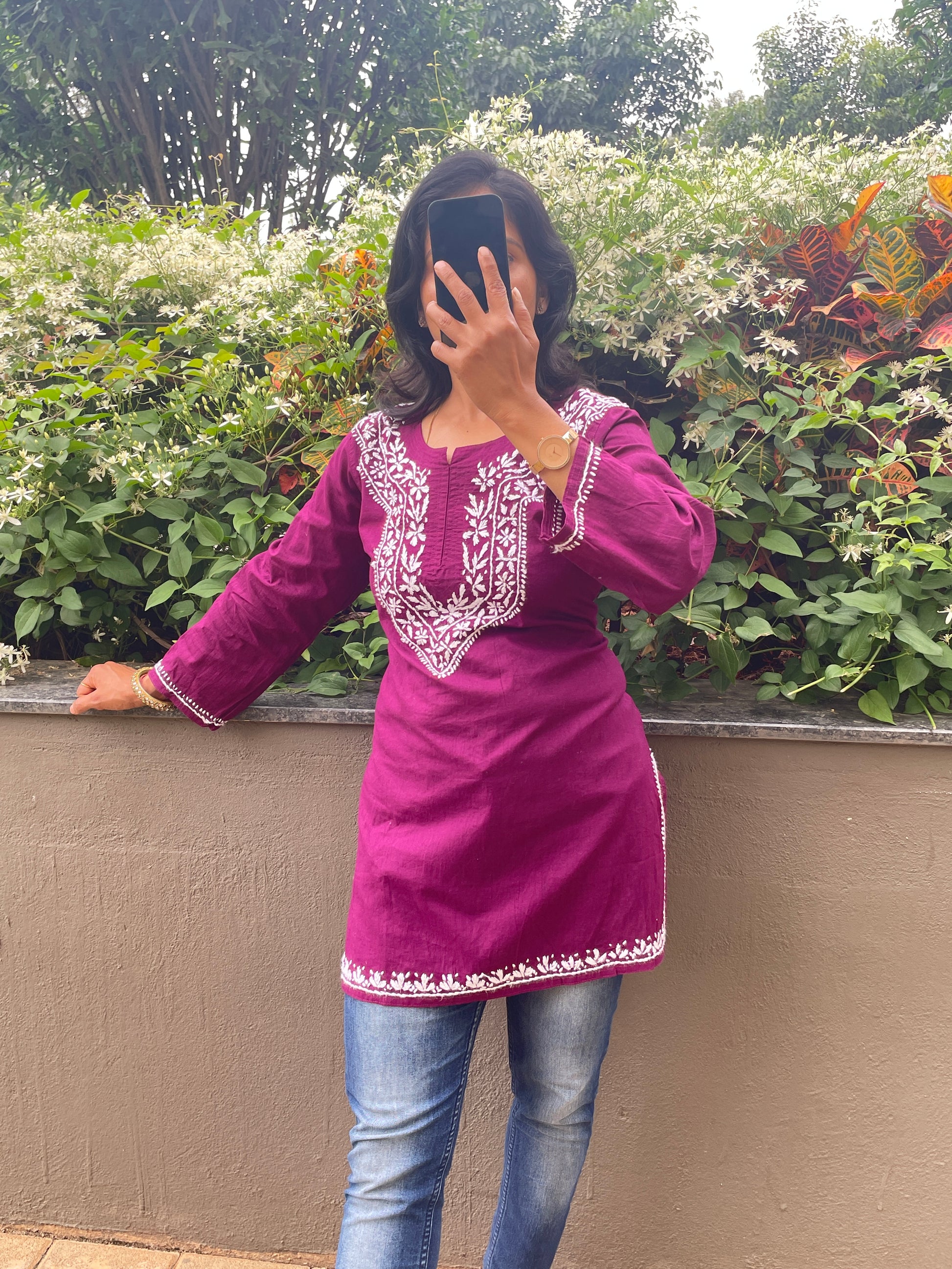 Cotton Chikankari Women's Short Kurta - Wine