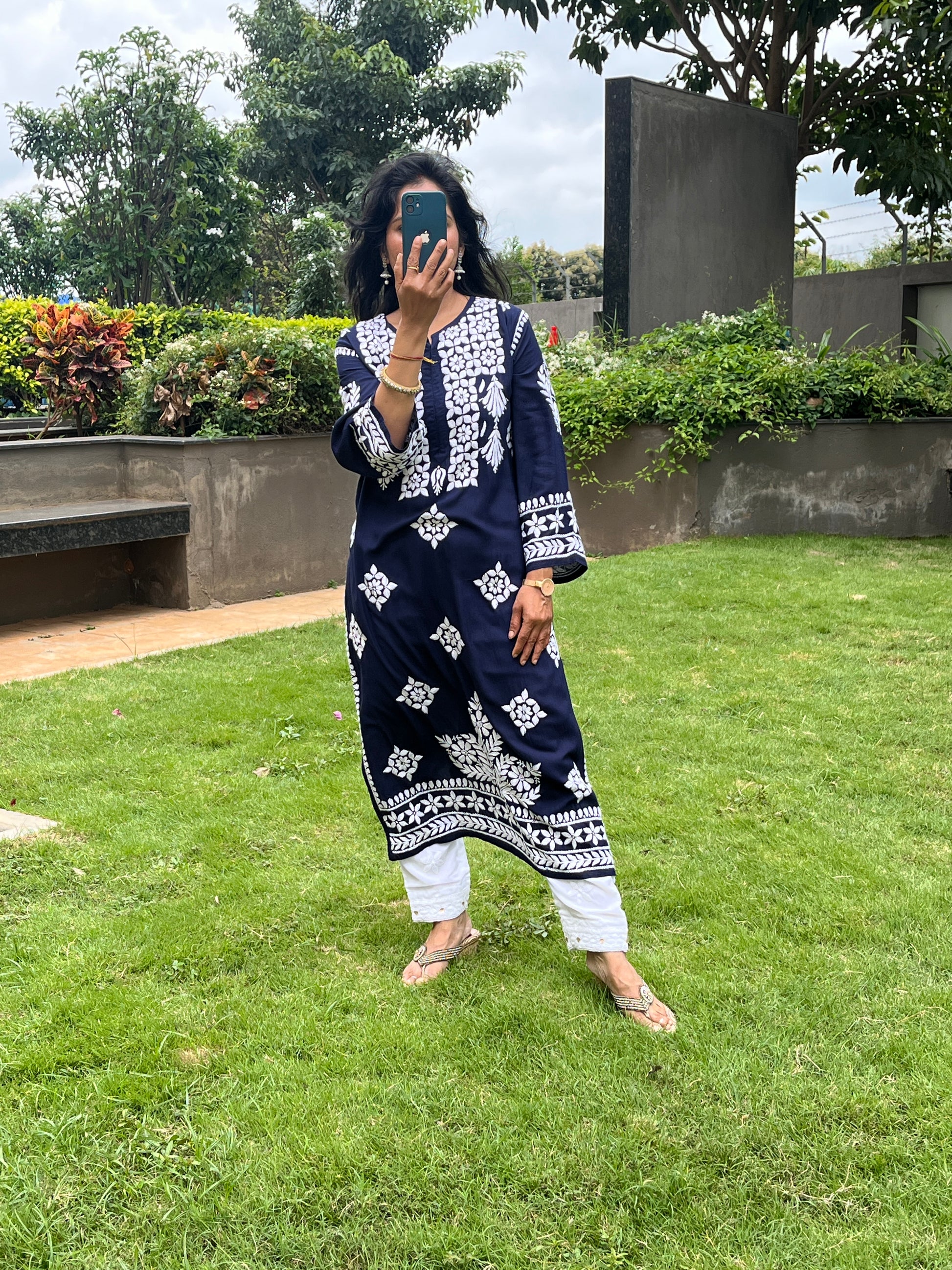 Modal 3D Chikankari Long Kurta - Navi Blue